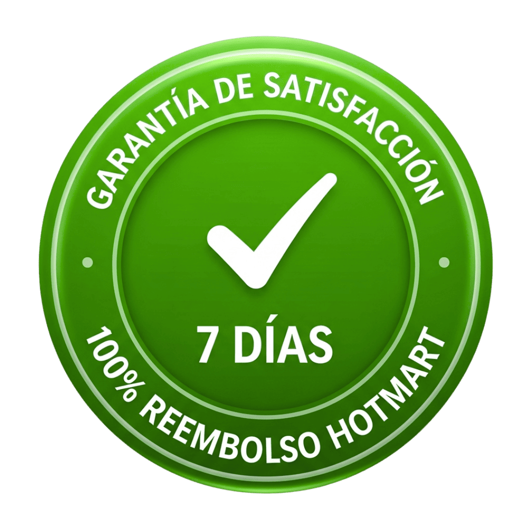 Recibirás el 100% de tu dinero de vuelta. Sin preguntas incómodas, sin llamadas, sin tener que justificarte con nosotros. Hotmart procesa tu devolución de forma automática e inmediata.